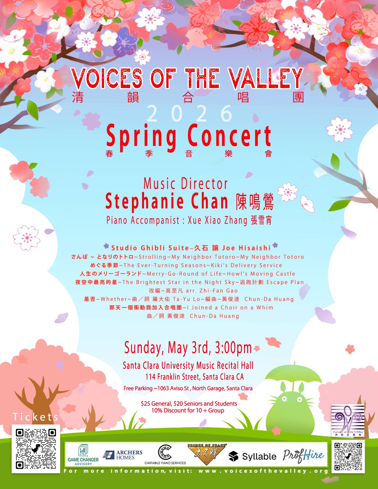 Many of VoV's singers are Silicon Valley high-tech professionals who are passionate about choral music. VoV’s repertoire includes a vast selection of works from different genres, cultures and musical periods, specializing in staged choral works and modern music. To name a few: Scarlatti’s Te Deum Laudamus, Mozart’s Requiem, Schubert’s Rosamunde, Faure’s Requiem, Johann Strauss Jr’s Die Fledermaus, Gilbert and Sullivan’s operettas, Paul McCartney’s Liverpool Oratorio, Andrew Lloyd Webber’s Phantom of the Opera and Sunset Boulevard, Huang Zi’s Song of Eternal Lament, Huang YauTai’s Mulan Joins the Army, Hsu Tsang-Houei’s The Legend of the White Snake and Chen Yi’s Chinese Poems.