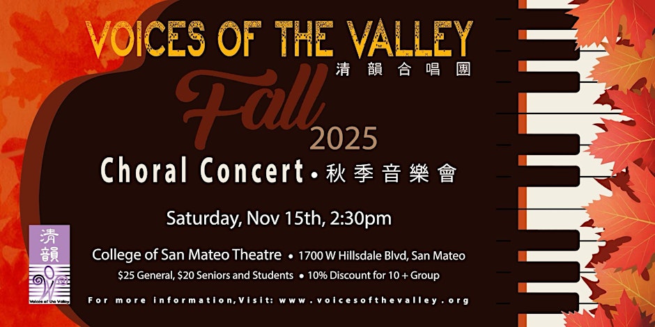 Many of VoV's singers are Silicon Valley high-tech professionals who are passionate about choral music. VoV’s repertoire includes a vast selection of works from different genres, cultures and musical periods, specializing in staged choral works and modern music. To name a few: Scarlatti’s Te Deum Laudamus, Mozart’s Requiem, Schubert’s Rosamunde, Faure’s Requiem, Johann Strauss Jr’s Die Fledermaus, Gilbert and Sullivan’s operettas, Paul McCartney’s Liverpool Oratorio, Andrew Lloyd Webber’s Phantom of the Opera and Sunset Boulevard, Huang Zi’s Song of Eternal Lament, Huang YauTai’s Mulan Joins the Army, Hsu Tsang-Houei’s The Legend of the White Snake and Chen Yi’s Chinese Poems.